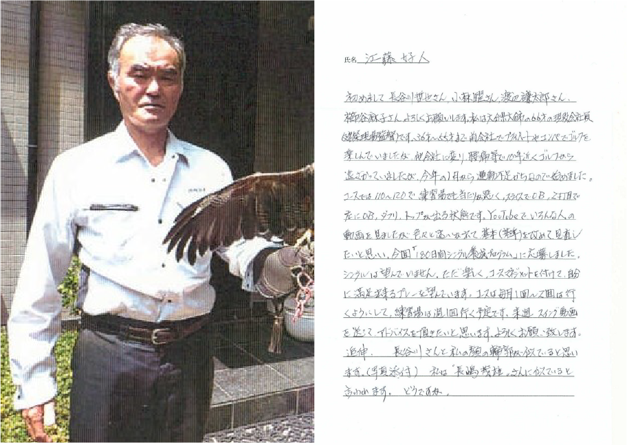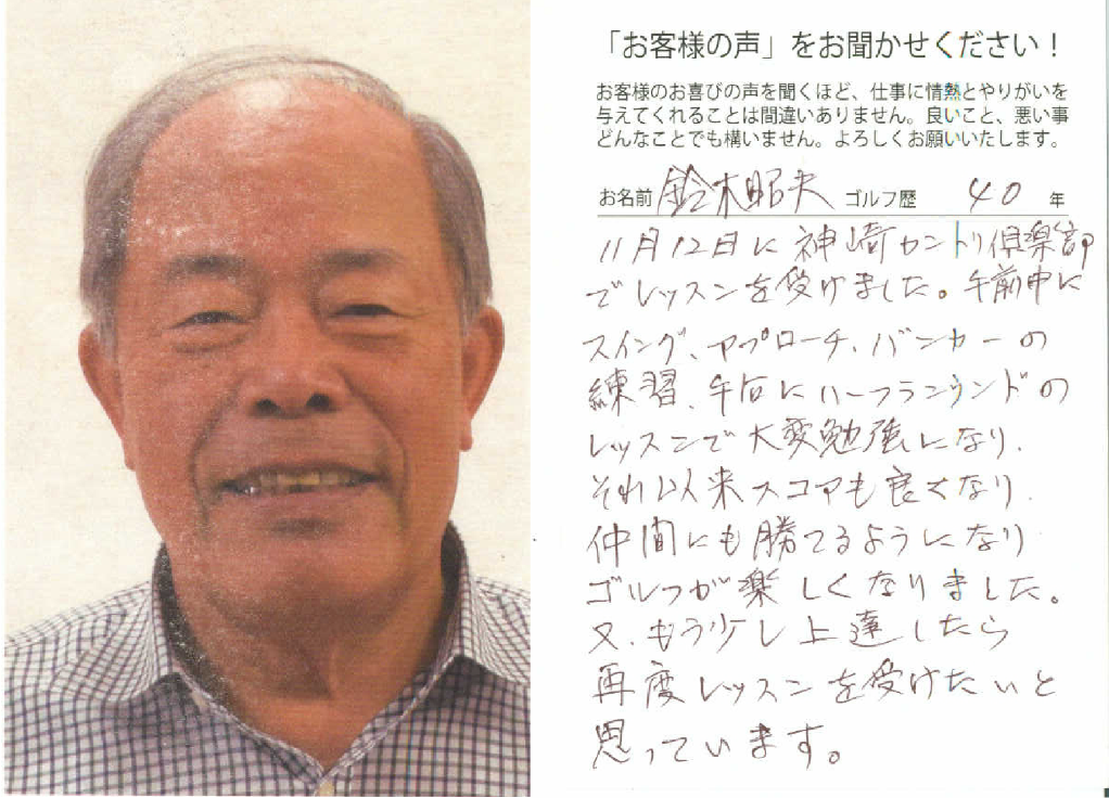 「今回のレッスンは目からうろこの事ばかりでした。今回教わったことや180日間シングルレッスン動画内容をしっかり体に叩き込み、シングルをめざします。これからもご指導宜しくお願いいたしたす。」